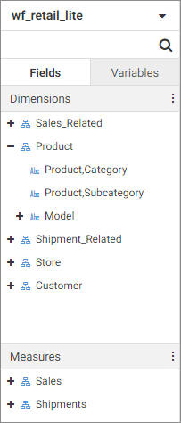The Variables tab contains a set of predefined parameters that you can use to add information to the chart header or footer, build dynamic calculated fields, or quickly create filters based on conditions defined in the data source.