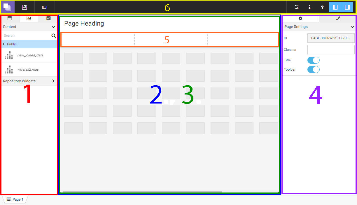 When creating a page, WebFOCUS Designer includes the following components that contain different tools and functionality.