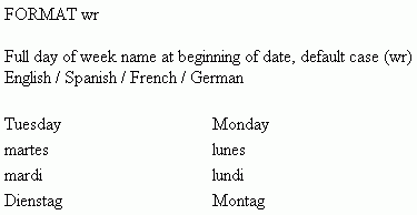 TABLE FILE VIDEOTRK HEADING "FORMAT wr" "" "Full day of week name at beginning of date, default case (wr)" "English / Spanish / French / German" "" SUM OUT1A AS '' OUT1B AS '' TRANSDATE NOPRINT OVER OUT1C AS '' OUT1D AS '' OVER OUT1E AS '' OUT1F AS '' OVER OUT1G AS '' OUT1H AS '' ON TABLE SET PAGE-NUM OFF ON TABLE SET STYLE * GRID=OFF, $ END