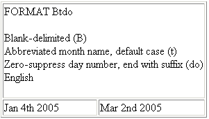 The following request prints a blank delimited date with an abbreviated month name in English. Initial zeros in the day number are suppressed, and a suffix is added to the end of the number: