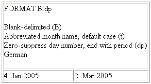 The following request prints a blank delimited date, with an abbreviated month name in German. Initial zeros in the day number are suppressed, and a period is added to the end of the number: