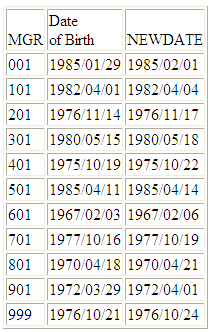 DEFINE FILE WF_RETAIL NEWDATE/YYMD = DTADD(DATE_OF_BIRTH, DAY, 3); MGR/A3 = DIGITS(ID_MANAGER, 3); END TABLE FILE WF_RETAIL SUM MGR NOPRINT DATE_OF_BIRTH NEWDATE BY MGR ON TABLE SET PAGE NOPAGE END