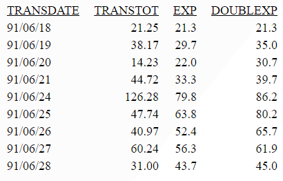 TABLE FILE VIDEOTRK SUM TRANSTOT COMPUTE EXP/D15.1 = FORECAST_EXPAVE(MODEL_DATA,TRANSTOT,1,0,3); DOUBLEXP/D15.1 = FORECAST_DOUBLEXP(MODEL_DATA,TRANSTOT,1,0,3,3); BY TRANSDATE WHERE TRANSDATE NE '19910617' ON TABLE SET STYLE * GRID=OFF,$ END