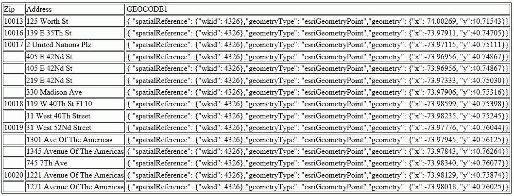 DEFINE FILE WF_RETAIL_LITE GADDRESS/A200 =ADDRESS_LINE_1 || ' ' | CITY_NAME || ' ' | STATE_PROV_NAME || ' ' | POSTAL_CODE; GEOCODE1/A200 = GIS_GEOCODE_ADDR(GADDRESS); END TABLE FILE WF_RETAIL_LITE PRINT ADDRESS_LINE_1 AS Address GEOCODE1 BY POSTAL_CODE AS Zip WHERE CITY_NAME EQ 'New York' WHERE POSTAL_CODE FROM '10013' TO '10020' ON TABLE SET PAGE NOPAGE END