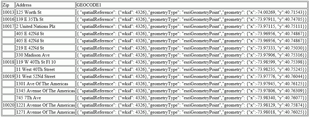 DEFINE FILE WF_RETAIL_LITE GEOCODE1/A200 = GIS_GEOCODE_ADDR_POSTAL(ADDRESS_LINE_1, POSTAL_CODE); END TABLE FILE WF_RETAIL_LITE PRINT ADDRESS_LINE_1 AS Address GEOCODE1 BY POSTAL_CODE AS Zip WHERE CITY_NAME EQ 'New York' WHERE POSTAL_CODE FROM '10013' TO '10020' ON TABLE SET PAGE NOPAGE END