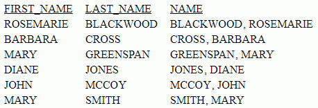 LAST_NAME LAST_INIT_CODE LAST_INIT --------- -------------- --------- SMITH 83 S JONES 74 J MCCOY 77 M BLACKWOOD 66 B GREENSPAN 71 G CROSS 67 C