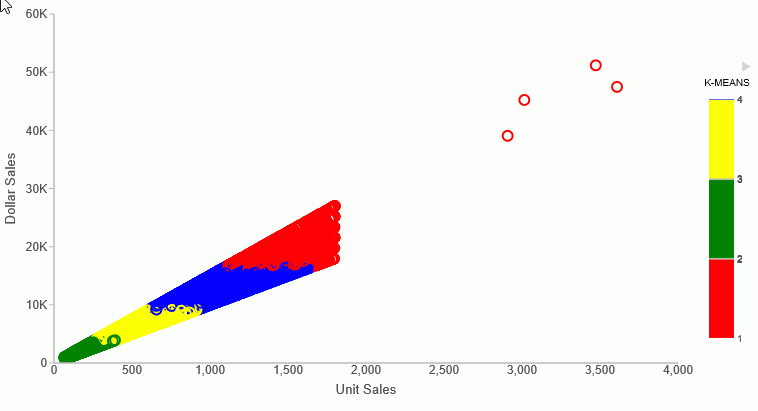 The following request partitions the DOLLARS field values into four clusters and displays the result as a scatter chart in which the color represents the cluster. The request uses the default values for the percent, iterations, and tolerance parameters by passing them as the value 0 (zero).