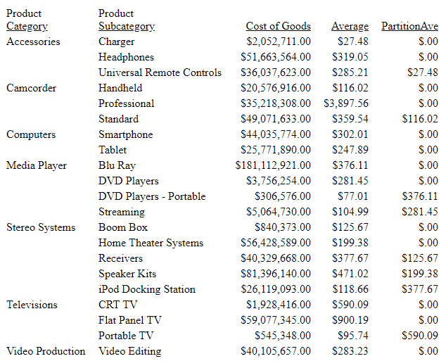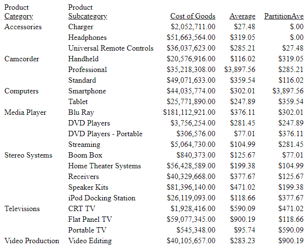 COMPUTE PartitionAve/D12.2M=PARTITION_REF(AVE.COGS_US, PRODUCT_CATEGORY, -2);