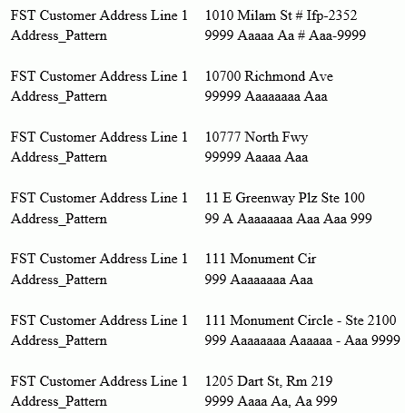 The partial output is shown in the following image. Note that the special characters (#-,) in an address are represented in the pattern as is.