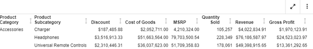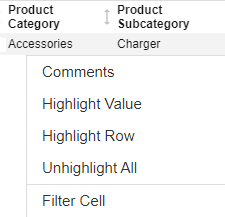 The Filter Cell option enables you to filter the report for just that row in the report. For example, if you want to see Accessories, you would click on Accessories in the report to enable the cell menu. In this case, the request returns just the values for Accessories, as shown in the following image.