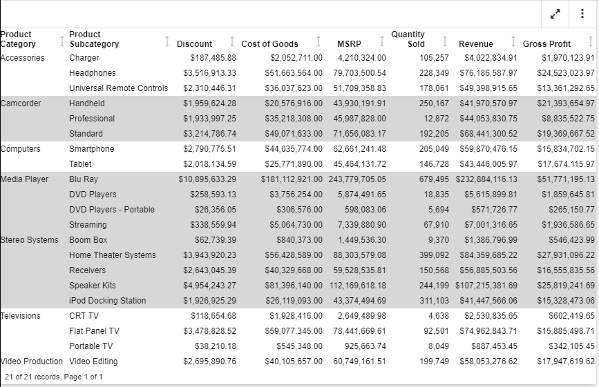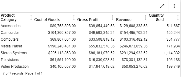In this example, the Gross Profit data is sorted in ascending order, from lowest to highest. If you click the arrow again, the column sorts in descending order, from highest to lowest. If you click the arrow again, it returns to the default arrow that points in both directions, indicating that no sort has been applied, as shown in the following image.
