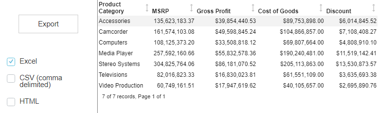 Export. Exports the underlying data or image for the current component. For reports, you can export in Excel, CSV (comma delimited), and HTML format. For charts, you can export to Excel, CSV (comma delimited), and PNG (image) format.