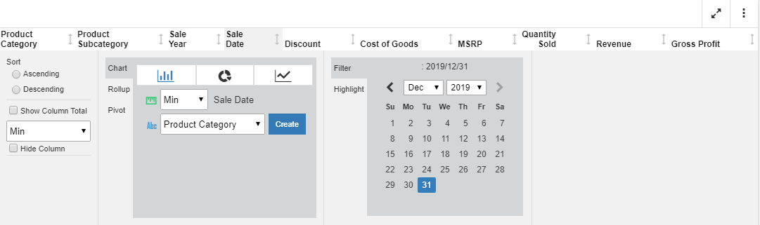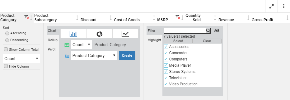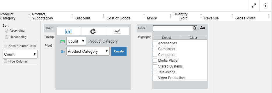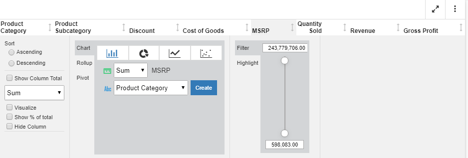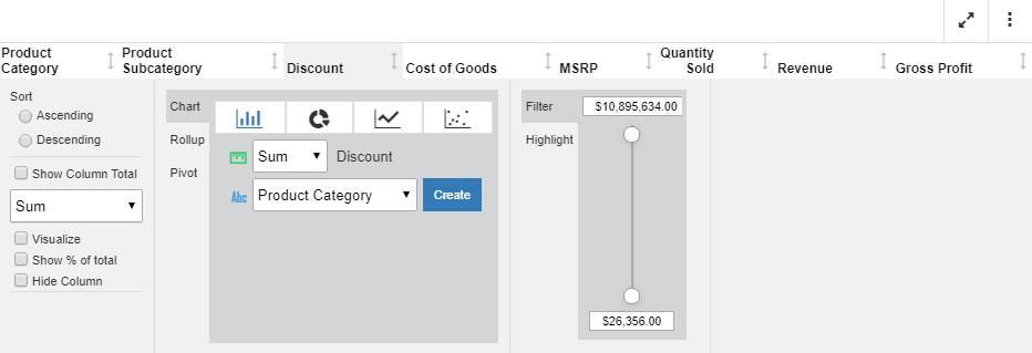 Chart Rollup. Select a chart type and, optionally, specify an aggregation other than the default value, Sum. Select a column for which to create the chart and click Create. The chart is created in a separate dialog box, enabling you to interact with the chart using the chart features and options.