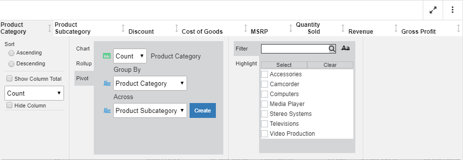 Pivot. Use the Pivot option to create a cross-tab Pivot table. You can select an aggregation for the currently selected column. Next, specify a column value by which to group the report. Indicate an Across value to create the across values in your table. Click Create to create the pivot table, which displays in the analysis panel, as shown in the following image.