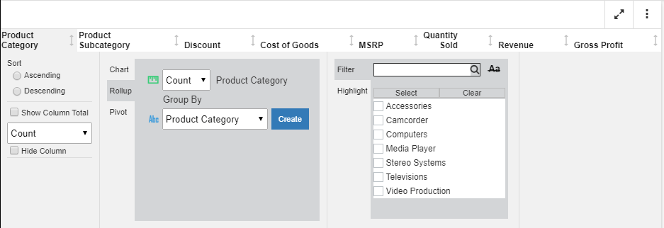 Rollup. Use the Rollup option to select an aggregation for the currently selected column. You can also select a Group By value, options for which include the list of different columns in the report. Once you have made your selections, click Create to create the rollup, as shown in the following image.