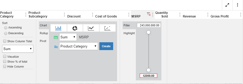 Numeric Slider. If you are working with a measure value (for example, MSRP), you can use the slider tool to narrow the values you want to display. The slider shows the lowest to highest values in your measure, as shown in the following image.