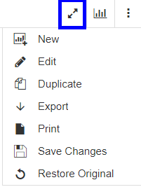 When your interface is not in maximized mode (default), the toolbar has a maximize button, as well as a button to quickly change the chart type, which applies only to a chart component. There is also a vertical Ellipsis menu that allows you to navigate to additional options. These options are shown in the following image.