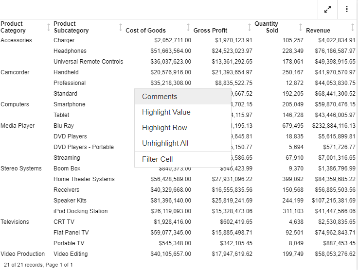 Using the Designer Style interactive report, the cell menu allows you to customize the display of your report, while adding the ability to quickly add filters. The cell menu displays when you click on each cell in a report. This enables you to highlight an individual value or a row or add comments about this individual cell in your report. You can also reverse a previously highlighted aspect. The cell menu is shown in the following image.