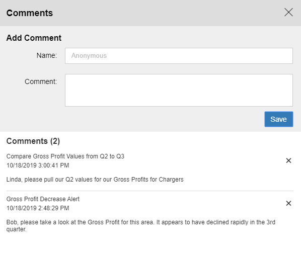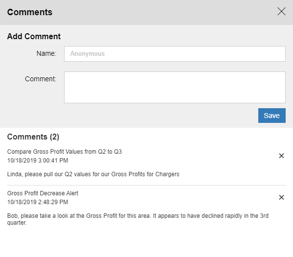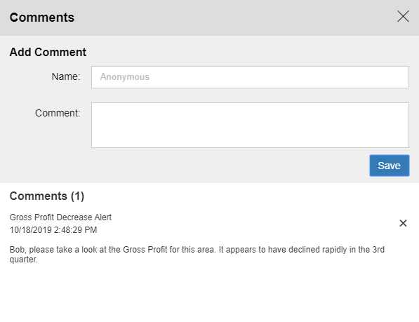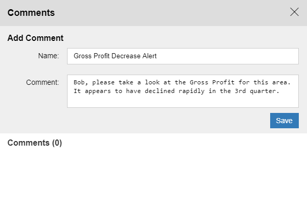 In the Comments dialog box, you can enter a name for the comment, as well as comment text itself. An example of a comment is shown in the following image.