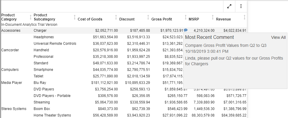 You can add comments to the individual cells within an interactive report that use In-Document Analytics capabilities, to include information explaining your data, where it appears. For example, if you include data for Gross Profit, and you would like to include a comment about the decrease over the course of a quarter or year, you could add a comment to the Gross Profit cell that you want to call out. Recipients of this interactive report can view, and reply to your comments. Commenting is only available from the Cell menu on any given cell when creating a report.
