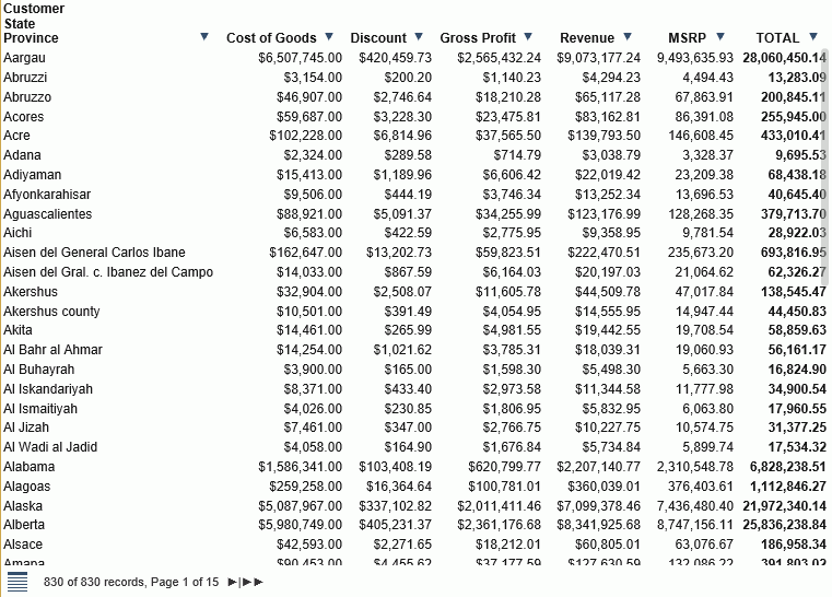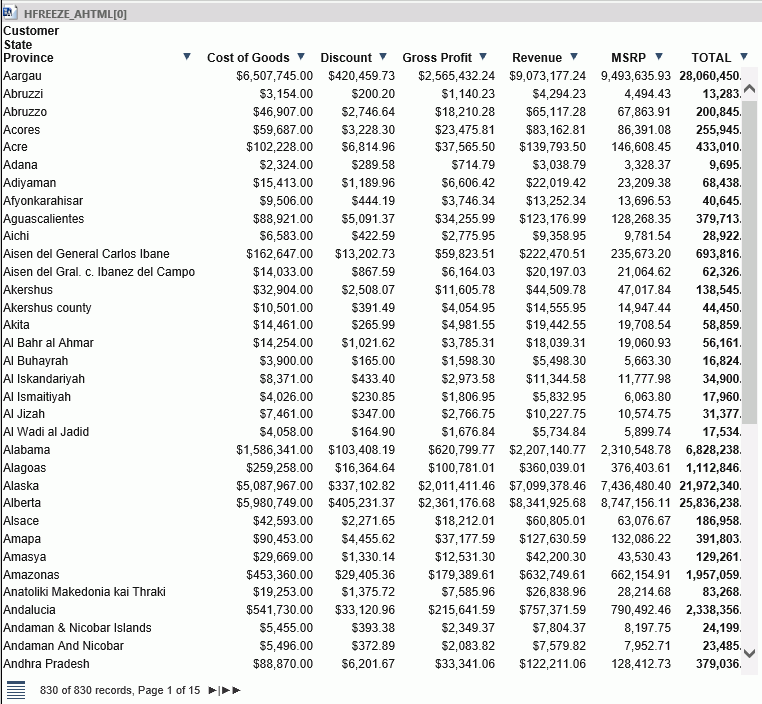 ENGINE INT CACHE SET ON SET PAGE-NUM=NOLEAD SET SQUEEZE=ON -DEFAULTH &WF_HTMLENCODE=ON; SET HTMLENCODE=ON SET HTMLCSS=ON -DEFAULTH &WF_EMPTYREPORT=ON; SET ARGRAPHENGINE=JSCHART SET EMPTYREPORT=ON SET EMBEDHEADING=ON SET GRAPHDEFAULT=OFF -DEFAULTH &WF_SUMMARY='Summary'; -DEFAULTH &WF_TITLE='WebFOCUS Report'; TABLE FILE wfretail82/wf_retail_lite SUM WF_RETAIL_LITE.WF_RETAIL_SALES.COGS_US WF_RETAIL_LITE.WF_RETAIL_SALES.DISCOUNT_US WF_RETAIL_LITE.WF_RETAIL_SALES.GROSS_PROFIT_US WF_RETAIL_LITE.WF_RETAIL_SALES.REVENUE_US WF_RETAIL_LITE.WF_RETAIL_SALES.MSRP_US BY WF_RETAIL_LITE.WF_RETAIL_GEOGRAPHY_CUSTOMER.STATE_PROV_NAME ON TABLE PCHOLD FORMAT AHTML ON TABLE ROW-TOTAL ON TABLE NOTOTAL ON TABLE SET CACHELINES 100 ON TABLE SET AUTOFIT OFF ON TABLE SET GRWIDTH 1 ON TABLE SET STYLE * INCLUDE=IBFS:/FILE/IBI_HTML_DIR/ibi_themes/Warm.sty,$ TYPE=REPORT, TITLETEXT=&WF_TITLE.QUOTEDSTRING, SUMMARY=&WF_SUMMARY.QUOTEDSTRING, ARGRAPHENGINE=JSCHART, HFREEZE=ON, $ ENDSTYLE END -RUNOnce you have enabled the column heading freeze feature, you must run your report to view the report with scroll bars.