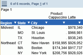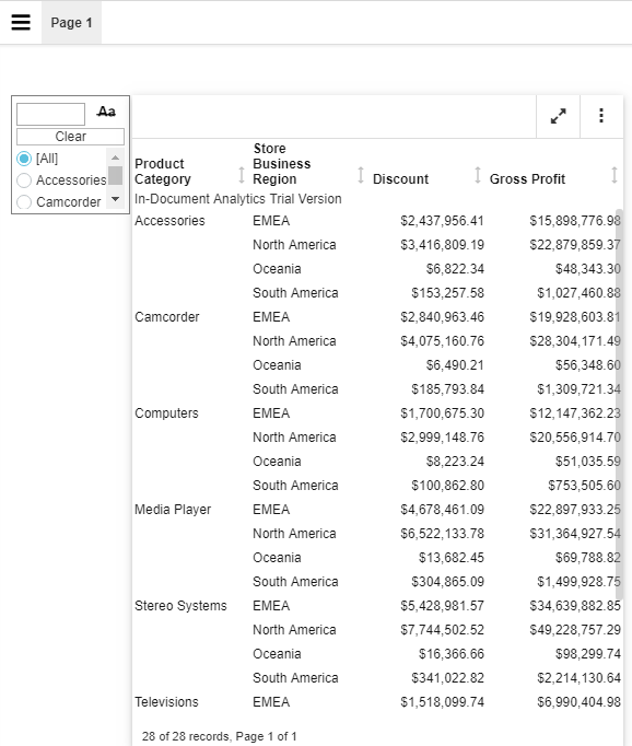 Note: All reports display with HFREEZE ON, a feature that freezes the headings in your report, in In-Document Analytics.