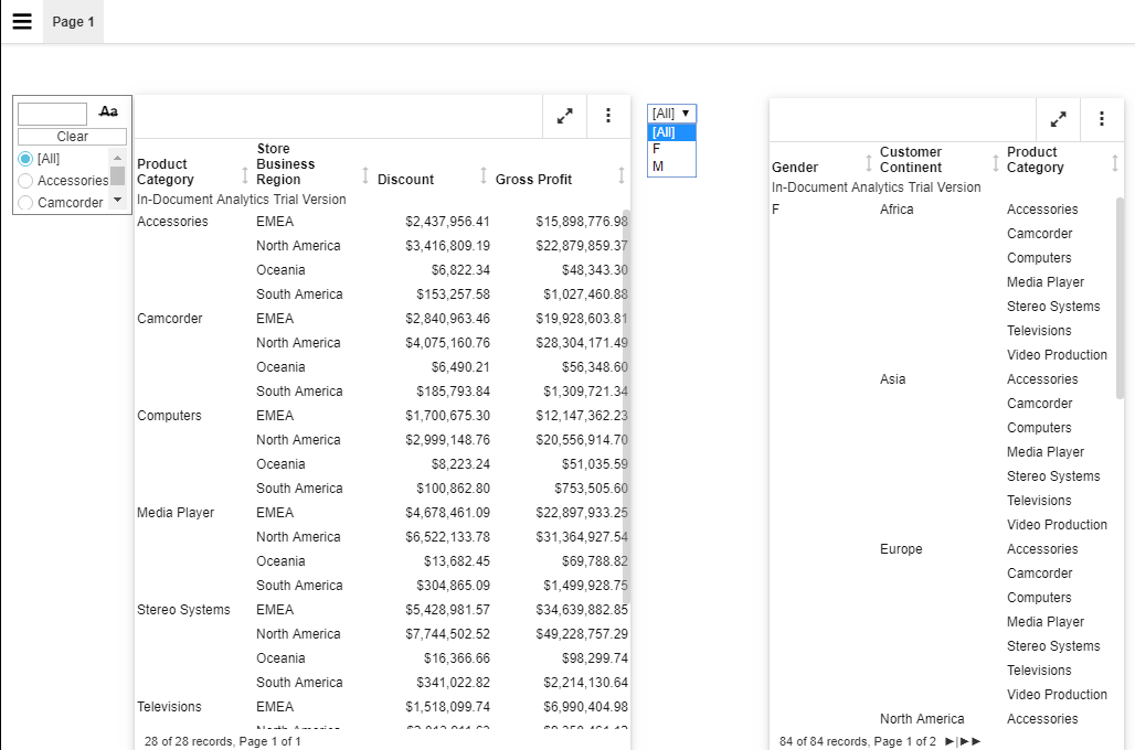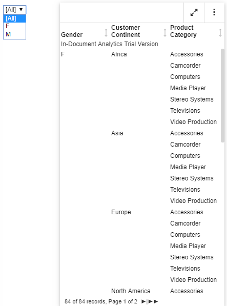 The second report contains information about the gender and geographic location of electronics consumers. The Gender field will be bound to a drop-down list. The list will display the values, F (female) and M (male). When you select a gender from the drop-down list, the report will be filtered by your selection.