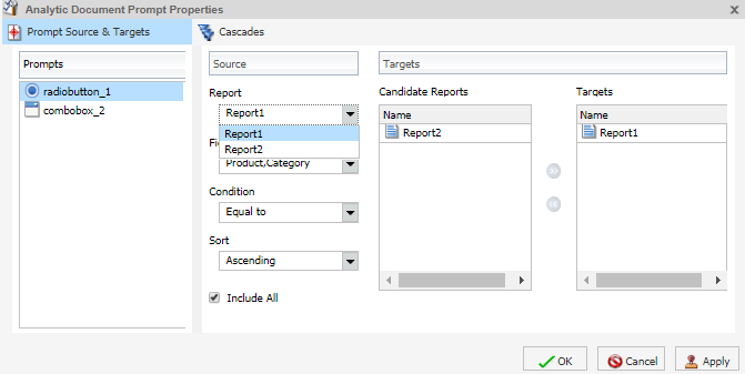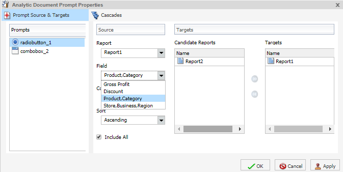 When you bind a field to an Analytic Document prompt, the default target report is the report from which you dragged the field. You can add or remove target reports from the prompt through the Analytic Document Options dialog box.