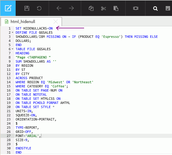 The following image shows an example procedure in the WebFOCUS Editor, with the HIDENULLACRS command turned ON.