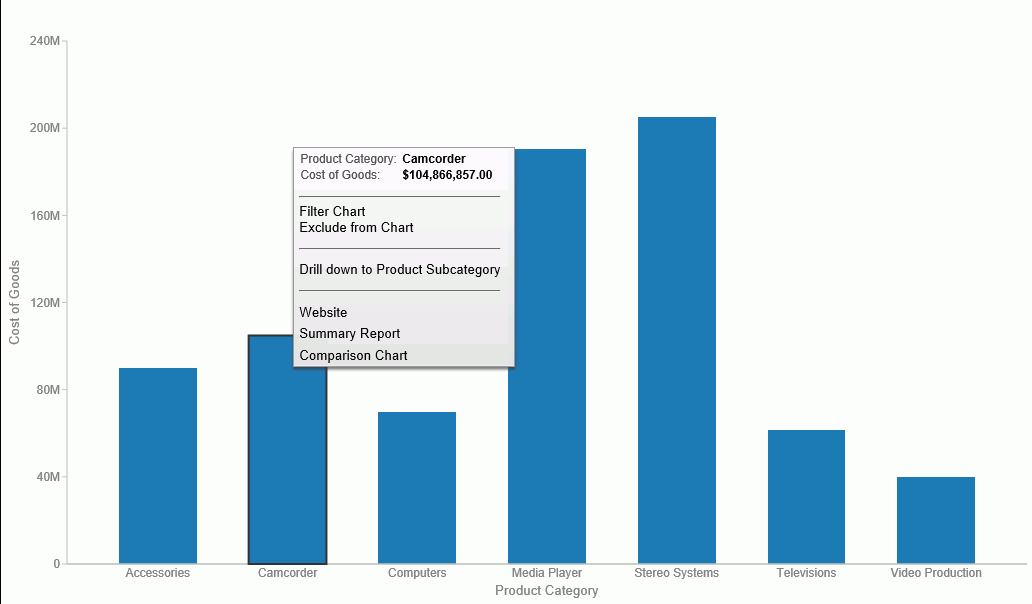 Similar to the functionality that is available in Chart mode, you can create multiple drill down links on a measure field in a visualization. This enables you to define custom links to other reports or websites, making it easy to link content from internal and external sources. Once defined, these links display on the shortcut menu that displays when you hover over a riser, as shown in the following image.