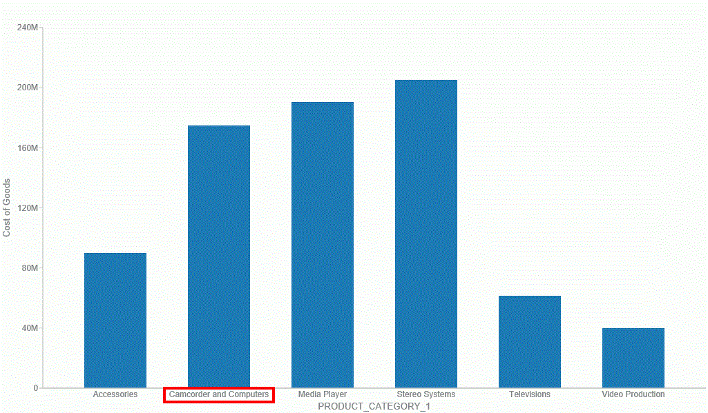 Once you group the values, they display in a unique group on the relevant axis. The group label is based on the original values stored for those components. For example, in the previous image, we grouped Camcorder and Computers in the PRODUCT_CATEGORY_1 group, as shown in the following image.