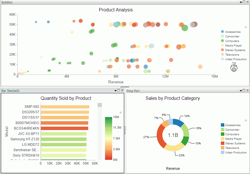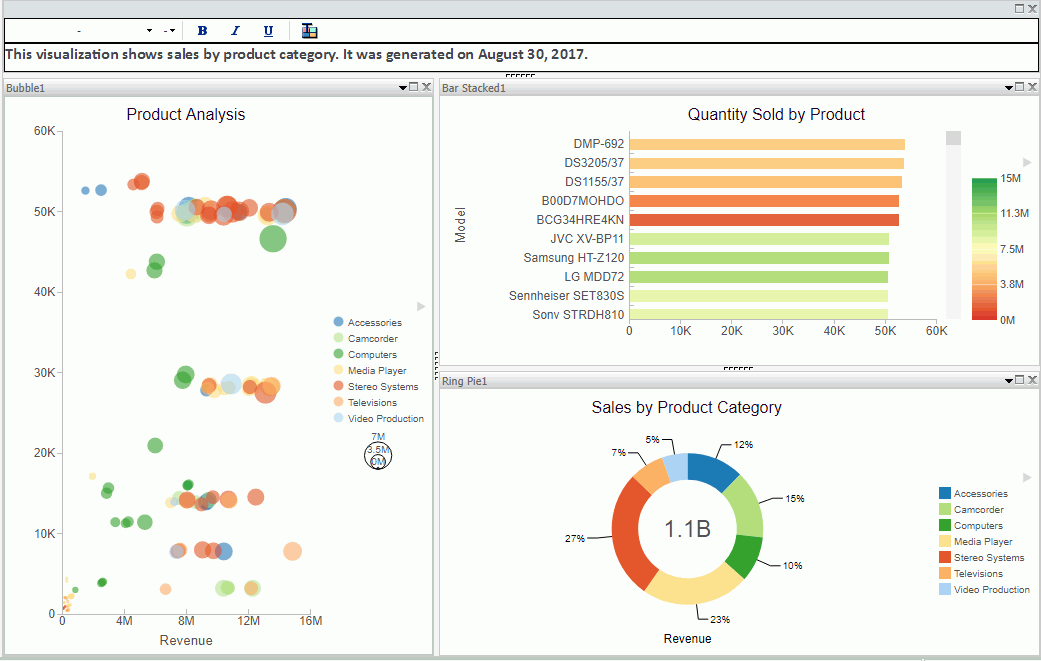 A visualization is comprised of one or more visuals, such as charts, maps, or grids and text. You can create different views of your data in a single visualization, and share that visualization with others in your enterprise.