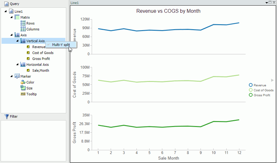 Note: You can revert your chart to an integrated display by right-clicking Vertical Axis and then clicking Multi-Y split.