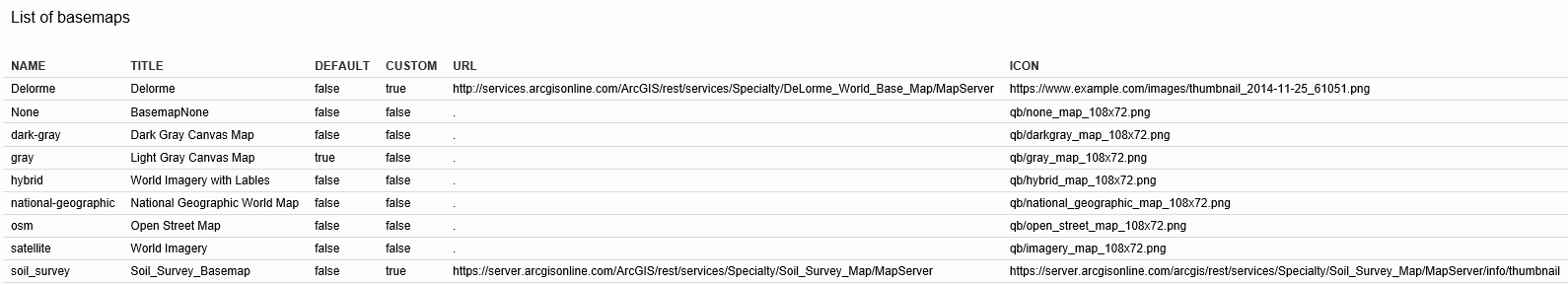 </BASEMAPS>The properties defined for the standard basemaps are custom (which is false for the standard basemaps), default, name, title, and icon.