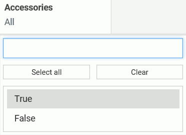 Note: As of Release 8.2 Version 03, query variables in Insight are available and functional on the Filter shelf. Typically, query variables display in the Data pane, above the measure fields. The filter values display as True or False, rather than one and zero. In addition, you can only select one value, as shown in the following image.