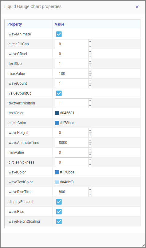 Some of the properties on the Extension properties panel apply to specific elements of the chart extension. For example, in the following image, the color of the wave in the liquid gauge chart has been changed to a darker shade of blue, and the number of waves has been increased from 1 to 3.