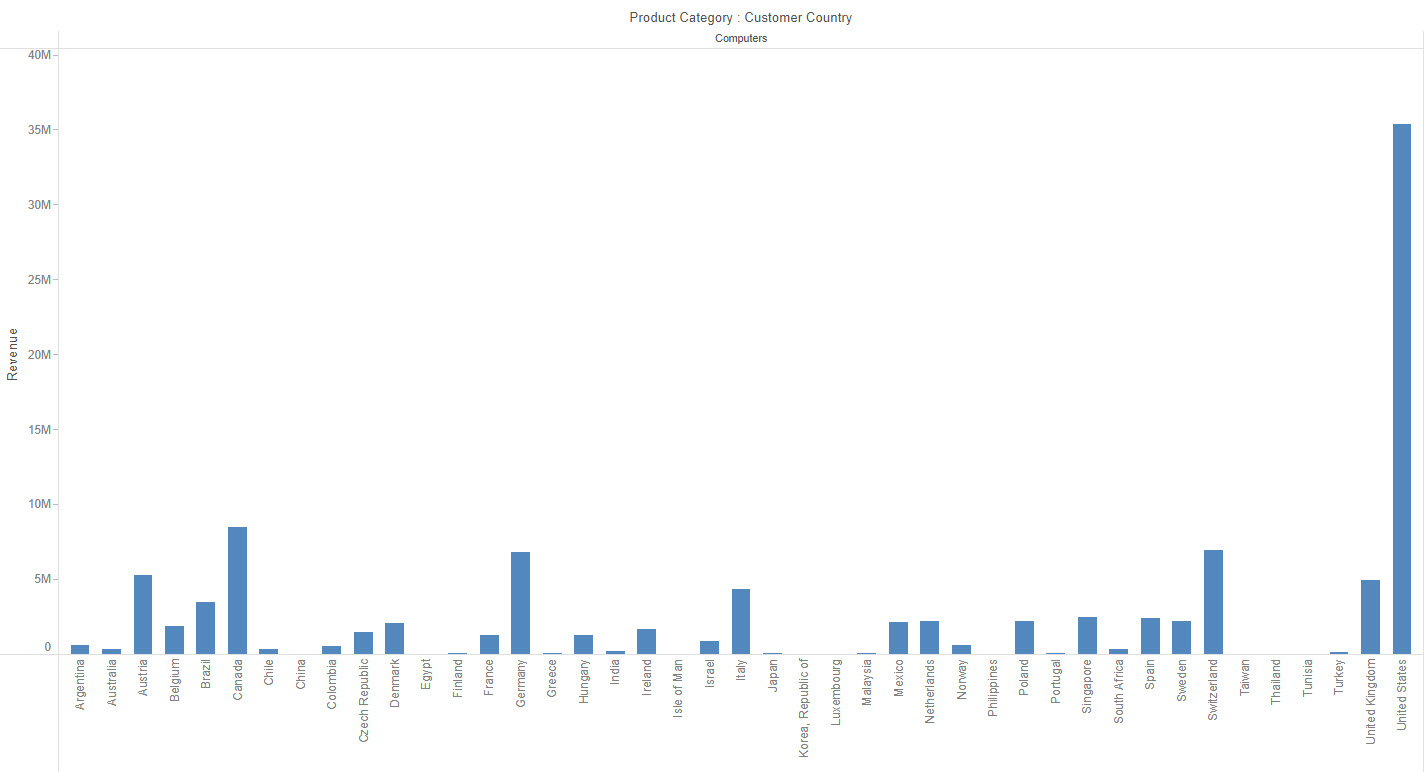 With Drill Anywhere, you can investigate the dimension values that contribute to the value of the selected riser in a chart, or row of a report. If you point to the riser for the product category of Computers and click Drill to Customer Country in the tooltip, then the resulting chart shows information about how much revenue was generated by computer sales in each country, as shown in the following image.