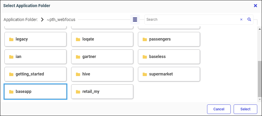 The Application Folder dialog box opens and displays your application folders in your current application path, as shown in the following image.