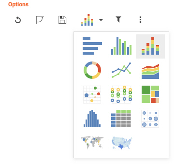 The Options toolbar is located in the upper-right corner of the Insight interface. These options control your interactions with your data, including options such as pivoting and filtering. You can also change your chart type using the Chart Picker option.