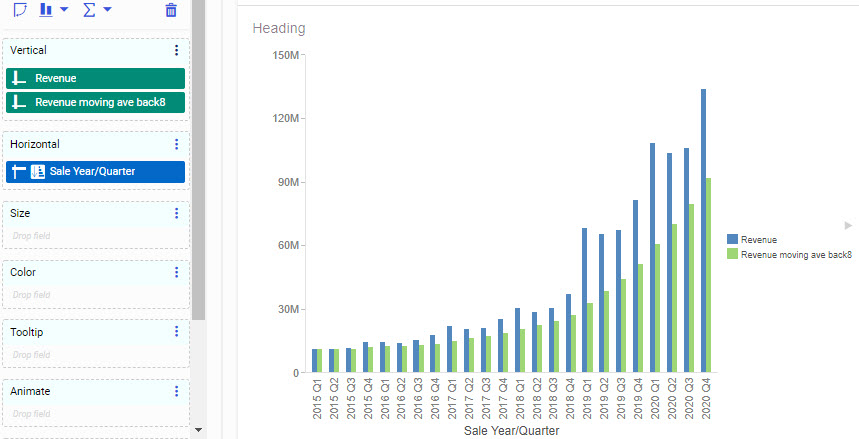 Notice that since we used a fairly high Look back value of 8, the moving average bars have a smooth growth that allows us easily identify a general pattern in the data, but do not increase quite as quickly as the actual revenue values.