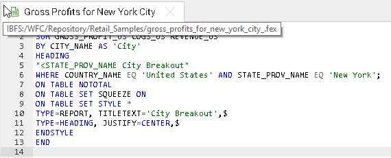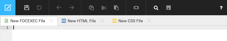 Once you choose a file type, the prompt closes and the Editor launches in a new browser tab or window, depending on your browser setting. Default file names begin with the word New, followed by the type of file, for example, New FOCEXEC File, New HTML File, and so on. Small glyphs consistent with the file type appear on the left side of the tab to help identify the type of file, as shown in the following image.