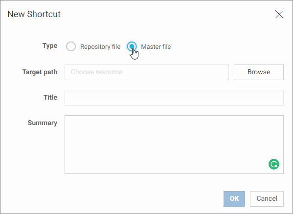 You can create shortcuts to repository files and Master files. Once a shortcut to a Master file is created, you can use it to build visualizations and reports. Once a shortcut to a repository file is created, you can copy, delete, edit, and run this item. You can also publish and share your shortcuts to make them available for other users and groups.