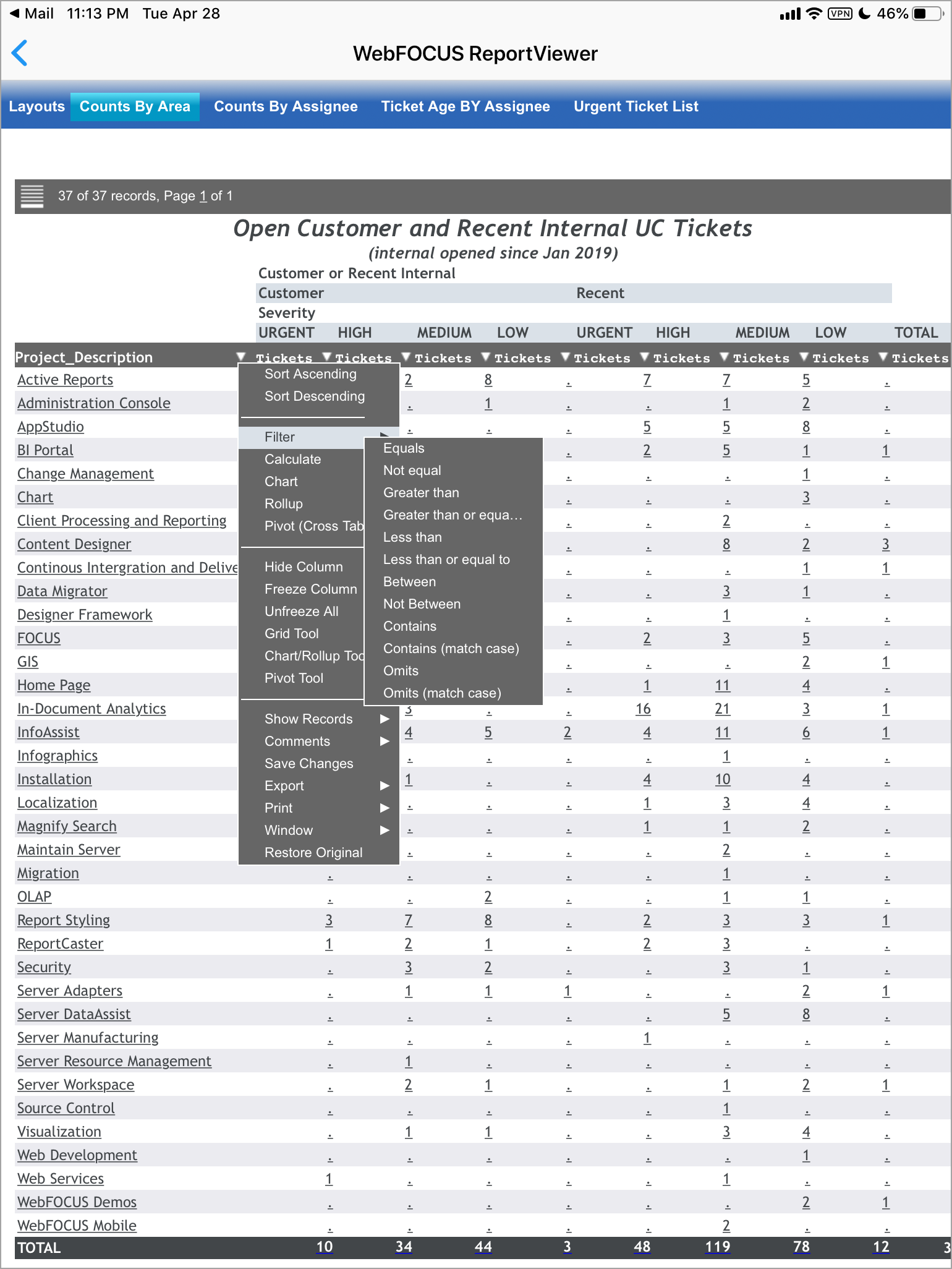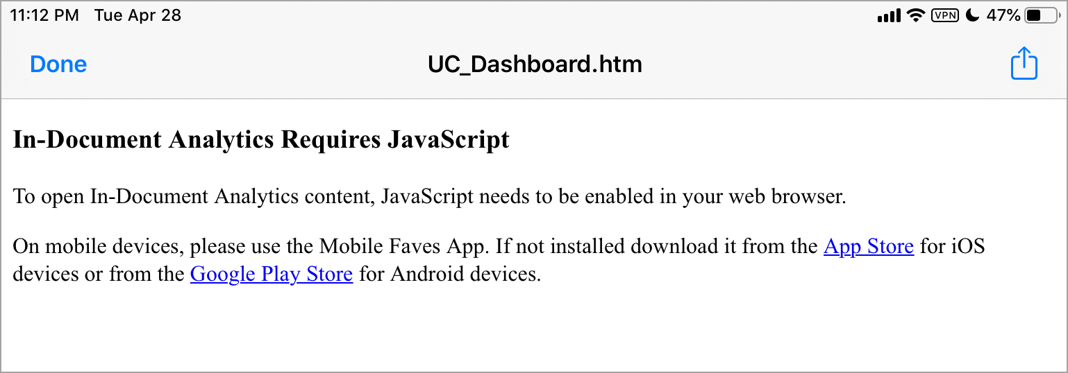 Viewing In-Document Analytics reports on mobile devices is only possible if JavaScript is enabled in the web browser. Some browsers may function differently depending on the operating system. WebFOCUS mobile app makes it easy to view any In-Document Analytics report on any iOS or Android-based device.