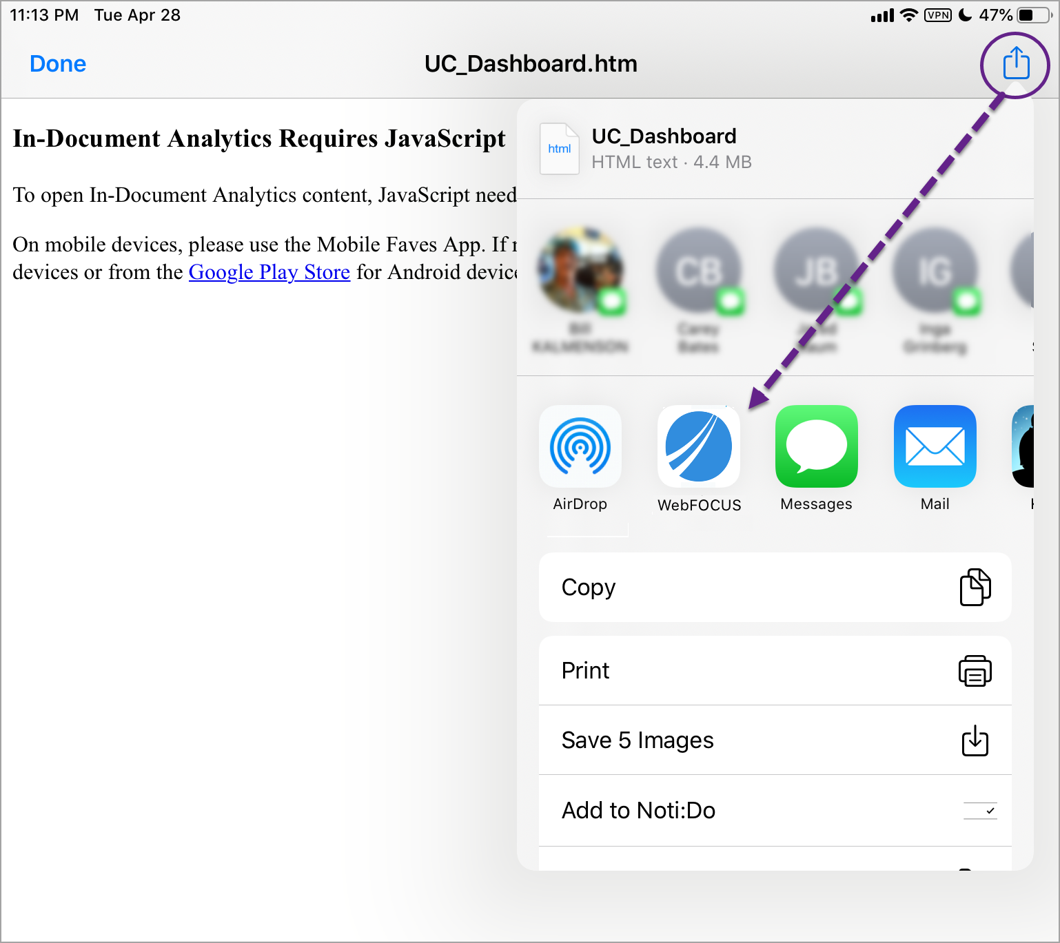 Note: Depending on your device and its preferences, you may need to scroll and tap More to see the Copy to WebFOCUS option.