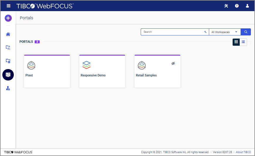 The Portals area displays all the portals that are currently available in your repository in one centralized location. Depending on your permissions, you can run and edit a portal from this directory. You can also add a portal to Favorites and view its properties. An example of the Portals area is shown in the following image.