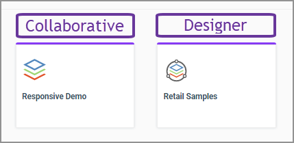 There are two types of portals that can be accessed in the Portals area: collaborative and designer. These types of portals are distinguished by their icons in the tile view. Collaborative portals display with the vertical stack icon, while the icon for designer portals shows the vertical stack inside a circle. The following image displays two different types of portals annotated.