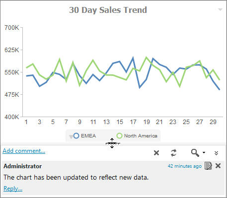 In a collaborative portal, you can use comments to interact with your peers in a multi-user environment. Access to the comments feature is configured in the Security Center, by an administrator.
