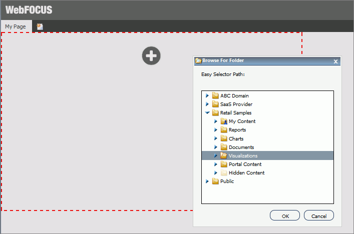 The Easy Selector container is added to the portal page. The Browse For Folder dialog box opens next to the Easy Selector container, allowing you to select a target folder.