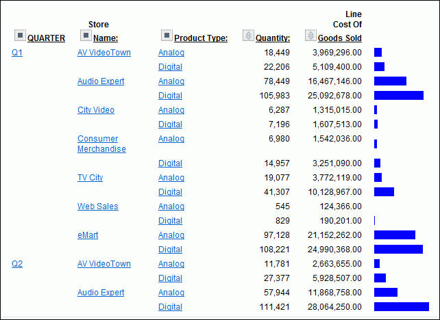 As shown in the following image, the report shows that Audio Expert has the highest sales in the digital product lines in Quarters 1 and 2, with eMart trailing slightly. Each value under the QUARTER, Store Name, and Product Type column is hyperlinked for more details.
