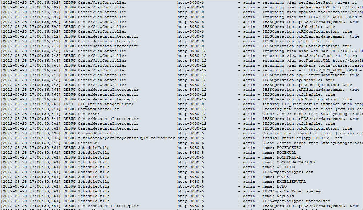 Note: You should also view the Application Server log files. By default, Apache Tomcat trace files are located in the \logs directory of the Apache Tomcat installation. If Apache Tomcat was installed by the Client, Apache Tomcat is installed under the ibi directory path. If ReportCaster is configured with Managed Reporting, you should also view the Client session trace files. In the Administration Console, you can access these trace files by clicking Configuration, Diagnostics, and then Session Monitor.